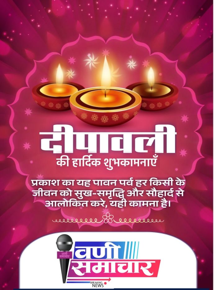 शुभेच्छा शुभ दिपावली By Wani Samachar - October 20, 2025 100 दीपावली की हार्दिक शुभकामनाएं। प्रकाश का यह पावन पर्व हर किसी के जीवन को सुख-समृद्धि और सौहार्द से आलोकित करे, यही कामना है। ■□■
