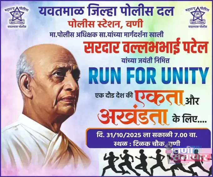लोहपुरुष सरदार वल्लभभाई पटेल यांच्या जयंतीनिमित्त ‘रन फॉर युनिटी’ या राष्ट्रीय एकता दौडचे (मॅरेथॉन) आयोजन उद्या ३१ ऑक्टोबर २०२५ रोजी सकाळी ठीक ७ वाजता वणी शहरात होणार आहे. यवतमाळ पोलीस दलाच्या मार्गदर्शनाखाली आणि माननीय पोलीस अधीक्षक श्री. कुमार चिंता साहेब यांच्या संकल्पनेतून वणी पोलीस स्टेशनच्या वतीने हे भव्य कार्यक्रम आयोजित करण्यात आले आहे.