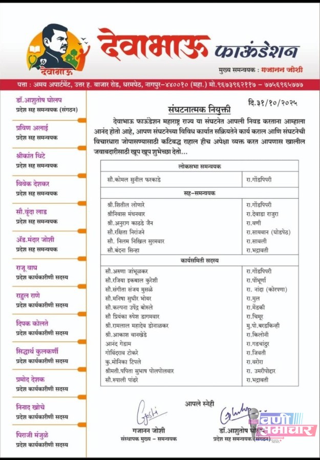 देवाभाऊ फाउंडेशनचे संस्थापक व मुख्य समन्वयक श्री.गजानन जोशी यांनी दि. ३१ ऑक्टोबर रोजी अनुराग काठेड जैन यांची चंद्रपूर-वणी-आर्णी लोकसभा क्षेत्राचा सह-समन्वयक पदी नियुक्ती केली. यावेळी त्यांना अधिकृत नियुक्तीपत्र प्रदान करण्यात आले.