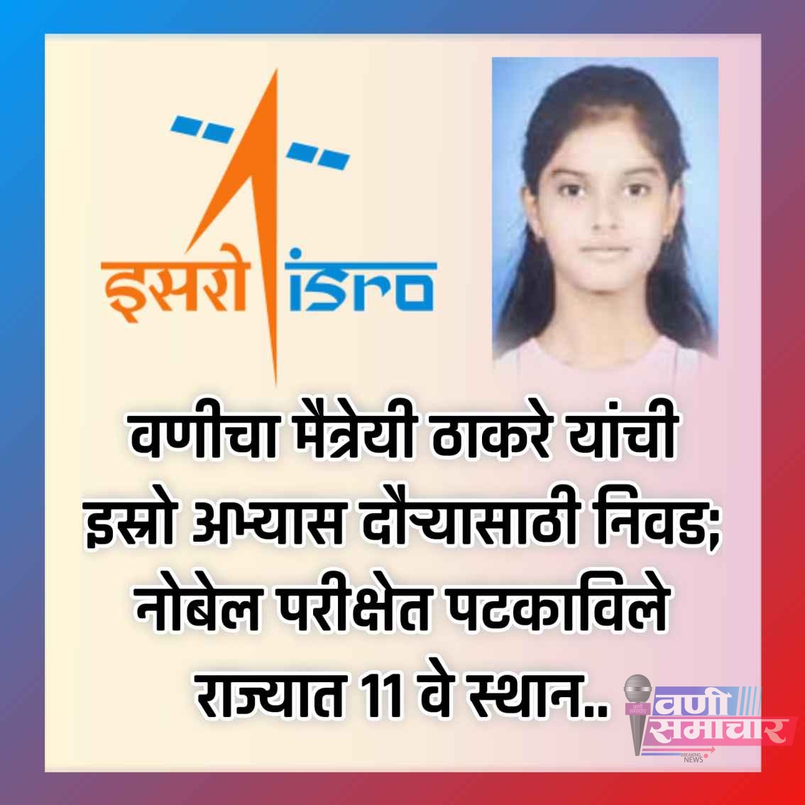 वणीचा मैत्रेयी ठाकरे यांची इस्रो अभ्यास दौऱ्यासाठी निवड; नोबेल परीक्षेत पटकाविले राज्यात ११ वे स्थान..