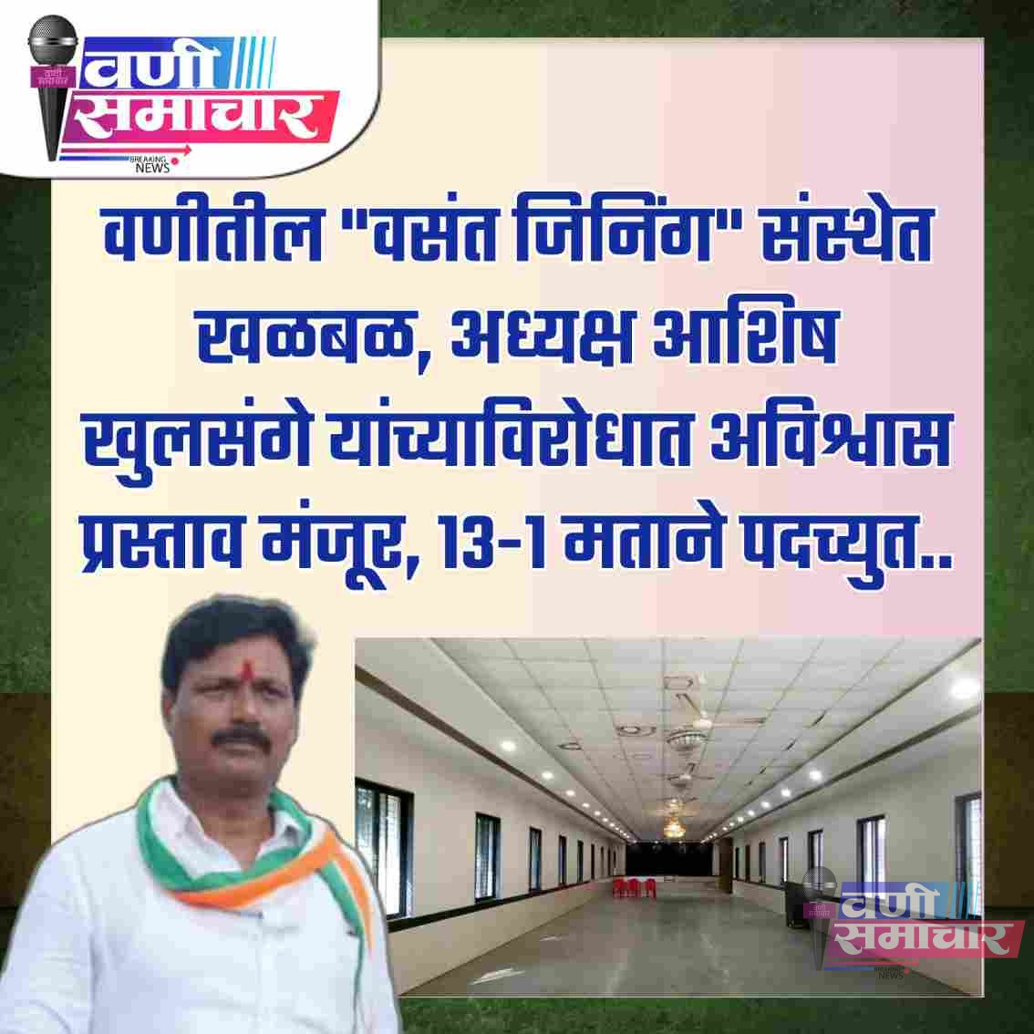 वणीतील नामांकित सहकारी संस्था वसंत को-ऑपरेटिव्ह शेतकरी जिनिंग अँड प्रेसिंग फॅक्टरी लि. मध्ये अंतर्गत कलहाने धुमाकूळ घातला असून, संस्थेचे अध्यक्ष आशिष आनंदराव खुलसंगे यांच्याविरोधातील अविश्वास प्रस्तावाने मंगळवारी (१२ नोव्हेंबर २०२५) सभा घेतली. १७ संचालकांच्या एकूण संख्येतून १४ संचालक उपस्थित असताना झालेल्या मतदानात १३ विरुद्ध १ मताने हा प्रस्ताव मंजूर झाला. यामुळे खुलसंगे यांना तात्काळ अध्यक्षपद सोडावे लागले असून, संस्थेच्या नेतृत्वात मोठे बदल अपेक्षित आहेत.