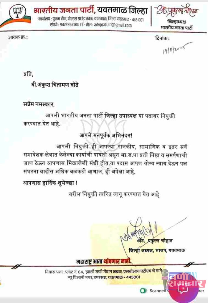 भाजप ने मास्टरस्ट्रोक, वणीतील प्रभावी मनसे शहराध्यक्ष अंकुश चिंतामण बोढे यांनी भाजपा मध्ये पक्षप्रवेश केला असून, भाजपा जिल्हाध्यक्ष प्रफुल्लजी चौहान यांनी त्यांना जिल्हा उपाध्यक्ष पदी नियुक्त करत, अधिकृत नियुक्तीपत्र दिले. शुक्वार (१४ नोव्हेंबर २०२५) भाजपा कार्यालयात झालेल्या कार्यक्रमात हा पक्षप्रवेश झाला.