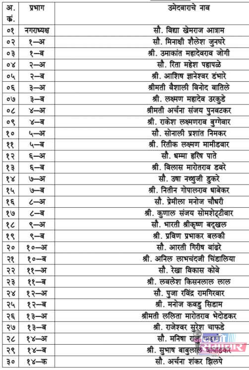 प्रदिर्घ चर्चेनंतर अखेर भाजपचा सर्वचासर्व 30 उमेदवार (1 नगराध्यक्ष + 29 नगरसेव) यांची यादी खाली दिल्या प्रमाणे आहे;