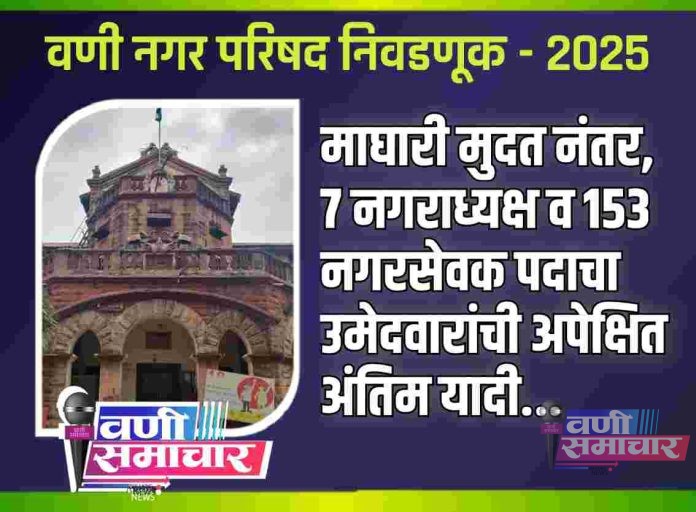 рд╡рдгреА рдирдЧрд░рдкрд░рд┐рд╖рджреЗрдЪреНрдпрд╛ рд╕рд╛рд░реНрд╡рддреНрд░рд┐рдХ рдирд┐рд╡рдбрдгреБрдХреАрдд рдЖрдЬ рдирд╛рдордирд┐рд░реНрджреЗрд╢рди рдЕрд░реНрдЬ рдорд╛рдШрд╛рд░реА рдШреЗрдгреНрдпрд╛рдЪреНрдпрд╛ рд╢реЗрд╡рдЯрдЪреНрдпрд╛ рджрд┐рд╡рд╢реА рдПрдХреВрдг (рен + рез) рео рдЙрдореЗрджрд╡рд╛рд░рд╛рдВрдиреА рдЖрдкрд▓реА рдЙрдореЗрджрд╡рд╛рд░реА рдорд╛рдЧреЗ рдШреЗрддрд▓реА. рдпрд╛рдордзреНрдпреЗ┬а рд╡рд┐рд╢реЗрд╖ рдмрд╛рдм рдореНрд╣рдгрдЬреЗ рдирдЧрд░рд╛рдзреНрдпрдХреНрд╖рдкрджрд╛рд╕рд╛рдареА рдЕрдкрдХреНрд╖ рдореНрд╣рдгреВрди рдЙрддрд░рд▓реЗрд▓реНрдпрд╛ рдПрдХрд╛ рдорд╣рд┐рд▓реЗрдЪреА рдорд╛рдШрд╛рд░.