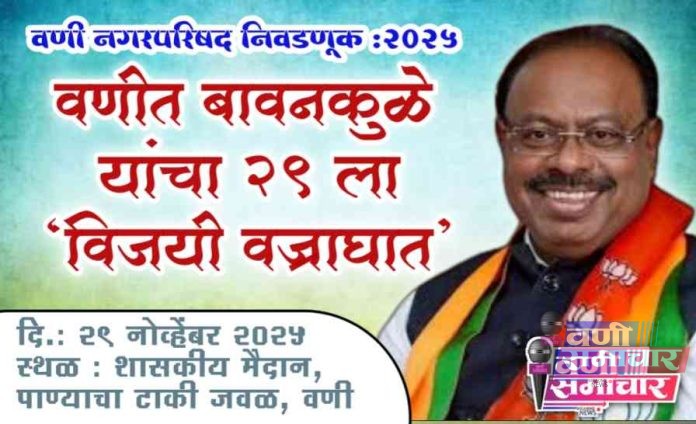 यवतमाळ जिल्ह्यातील वणी नगरपरिषदेच्या निवडणुकीत भाजपाने अंतिम टप्प्यात जोरदार शिंग लावली आहे. राज्याचे महसूलमंत्री चंद्रशेखर बावनकुळे यांचा २९ नोव्हेंबरला शहराला धडकणार असून, २९ नगरसेवक व थेट नगराध्यक्ष पदाच्या उमेदवारांसाठी भव्य रॅली व जाहीर सभा आयोजित करण्यात आली आहे. २ डिसेंबरला होणाऱ्या मतदानापूर्वी हा दौरा भाजपाच्या प्रचाराला नवा वेग देणारा ठरेल, असा विश्वास पक्ष नेत्यांनी व्यक्त केला आहे.