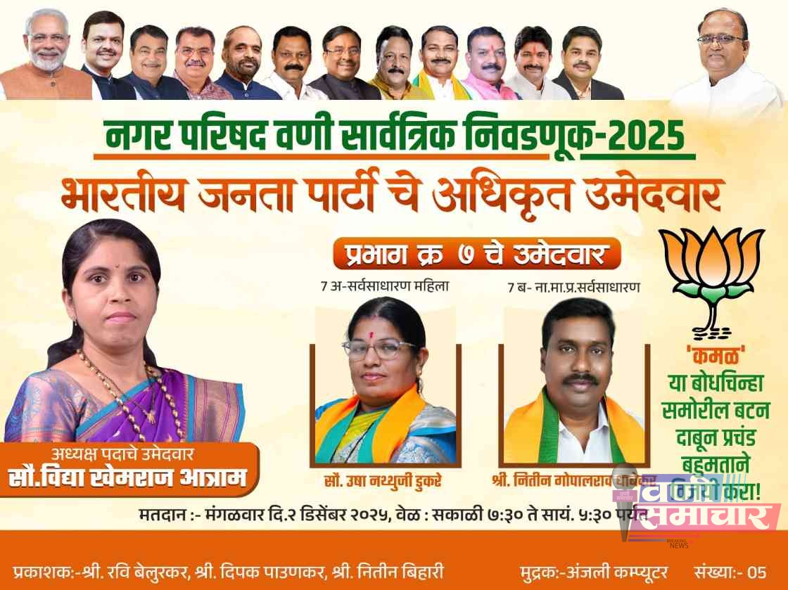 उद्या होणाऱ्या वणी नगरपरिषद मतदानाच्या  दिवशी भारतीय जनता पक्षाने प्रभाग क्रमांक ७ वर कमालीचा आक्रमक आणि घराघरांतील प्रचार केला. नगराध्यक्ष पदाच्या अधिकृत उमेदवार सौ. विद्या खेमराज आत्राम यांच्यासह या प्रभागातील दोन्ही जागांवरील भाजपचे अधिकृत उमेदवार सौ. उषा नथ्थुजी डुकरे (प्रभाग ७-अ, सर्वसाधारण महिला) आणि श्री. नितीन गोपालराव धाबेकर (प्रभाग ७-ब, नागरिक मागास प्रवर्ग सर्वसाधारण) यांना प्रचंड मतांच्या फरकाने विजयी करण्याचे ठाम आवाहन माजी आमदार संजीवरेड्डी बोदकुरवार, माजी जिल्हाध्यक्ष तथा माजी नगराध्यक्ष तारेंद्र बोर्डे आणि शहराध्यक्ष ऍड. निलेश चौधरी यांनी केले.