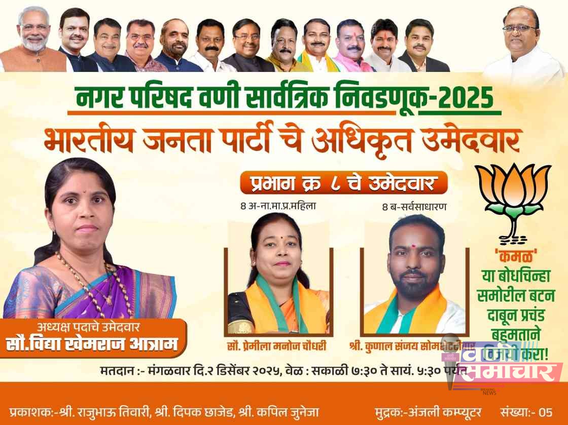 рдЙрджреНрдпрд╛ рд╣реЛрдгрд╛рд▒реНрдпрд╛ рд╡рдгреА рдирдЧрд░рдкрд░рд┐рд╖рдж рдорддрджрд╛рдирд╛рдЪрд╛ рджрд┐рд╡рд╕рд╛ рдЖрдЧреЛрджрд░ рднрд╛рд░рддреАрдп рдЬрдирддрд╛ рдкрдХреНрд╖рд╛рдиреЗ рдкреНрд░рднрд╛рдЧ рдХреНрд░рдорд╛рдВрдХ рео рд╡рд░ рдХрдорд╛рд▓реАрдЪрд╛ рдЬреЛрд░ рд▓рд╛рд╡рд▓рд╛. рдирдЧрд░рд╛рдзреНрдпрдХреНрд╖ рдкрджрд╛рдЪреНрдпрд╛ рдЕрдзрд┐рдХреГрдд рдЙрдореЗрджрд╡рд╛рд░ рд╕реМ. рд╡рд┐рджреНрдпрд╛ рдЦреЗрдорд░рд╛рдЬ рдЖрддреНрд░рд╛рдо рдпрд╛рдВрдЪреНрдпрд╛рд╕рд╣ рдпрд╛ рдкреНрд░рднрд╛рдЧрд╛рддреАрд▓ рджреЛрдиреНрд╣реА рдЬрд╛рдЧрд╛рдВрд╡рд░реАрд▓ рднрд╛рдЬрдкрдЪреЗ рдЕрдзрд┐рдХреГрдд рдЙрдореЗрджрд╡рд╛рд░ рд╕реМ. рдкреНрд░реЗрдорд┐рд▓рд╛ рдордиреЛрдЬ рдЪреМрдзрд░реА (рдкреНрд░рднрд╛рдЧ рео-рдЕ, рдирд╛рдЧрд░рд┐рдХ рдорд╛рдЧрд╛рд╕ рдкреНрд░рд╡рд░реНрдЧ рдорд╣рд┐рд▓рд╛) рдЖрдгрд┐ рд╢реНрд░реА. рдХреБрдгрд╛рд▓┬а рд╕рдВрдЬрдп рд╕реЛрдорд╢реЗрдЯреНрдЯреАрд╡рд╛рд░ (рдкреНрд░рднрд╛рдЧ рео-рдм, рд╕рд░реНрд╡рд╕рд╛рдзрд╛рд░рдг) рдпрд╛рдВрдирд╛ рдкреНрд░рдЪрдВрдб рдорддрд╛рдВрдЪреНрдпрд╛ рдлрд░рдХрд╛рдиреЗ рд╡рд┐рдЬрдпреА рдХрд░рдгреНрдпрд╛рдЪреЗ рдард╛рдо рдЖрд╡рд╛рд╣рди рдорд╛рдЬреА рдЖрдорджрд╛рд░ рд╕рдВрдЬреАрд╡рд░реЗрдбреНрдбреА рдмреЛрджрдХреБрд░рд╡рд╛рд░, рдорд╛рдЬреА рдЬрд┐рд▓реНрд╣рд╛рдзреНрдпрдХреНрд╖ рддрдерд╛ рдорд╛рдЬреА рдирдЧрд░рд╛рдзреНрдпрдХреНрд╖ рддрд╛рд░реЗрдВрджреНрд░ рдмреЛрд░реНрдбреЗ рдЖрдгрд┐ рд╢рд╣рд░рд╛рдзреНрдпрдХреНрд╖ рдНрдб. рдирд┐рд▓реЗрд╢ рдЪреМрдзрд░реА рдпрд╛рдВрдиреА рдХреЗрд▓реЗ.