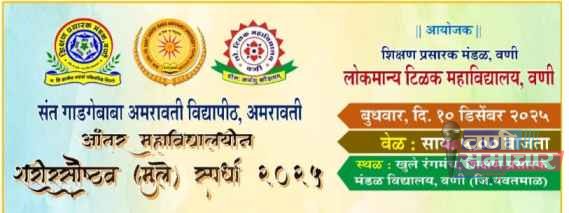 संत गाडगे बाबा अमरावती विद्यापीठाच्या आंतर महाविद्यालयीन शरीर सौष्ठव (मुले) स्पर्धेचे यजमानपद वणीतील लोकमान्य टिळक महाविद्यालयाने स्वीकारले असून, बुधवार, १० डिसेंबर २०२५ रोजी सायंकाळी ५ वाजता शिक्षण प्रसारक मंडळाच्या खुल्या रंगमंचावर या स्पर्धेचा शुभारंभ होणार आहे.