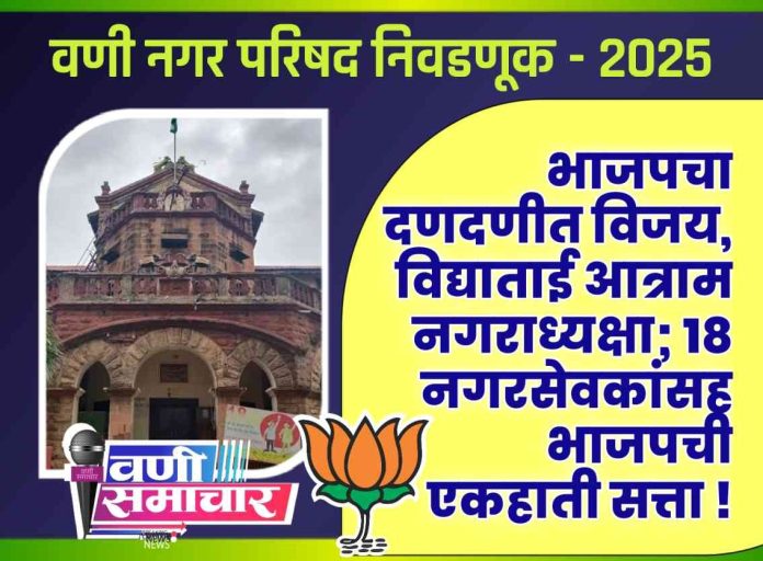 वणी नगरपरिषदेच्या सार्वत्रिक निवडणुकीत भारतीय जनता पक्षाने पुन्हा एकदा आपला दबदबा कायम ठेवला आहे. नगराध्यक्ष पदाच्या उमेदवार सौ. विद्या खेमराज आत्राम यांनी आपल्या निकटच्या प्रतिस्पर्धी शिवसेना (उबाठा) चा डॉ. संचिता नगराळे यांचा सुमारे ४,७९२ मतांच्या मोठ्या फरकाने पराभव करत विजय मिळवला. पक्षाला २९ नगरसेवक जागांपैकी १८ जागा मिळाल्या असून, उपाध्यक्ष पदही भाजप कडेच राहणार आहे. महा विकास आघाडीला ९ जागा (शिवसेना उबाठा ६, काँग्रेस ३), तर अपक्षांना २ जागा मिळाल्या. शिवसेना (शिंदे गट)ला मात्र एकही जागा जिंकता आली नाही.
