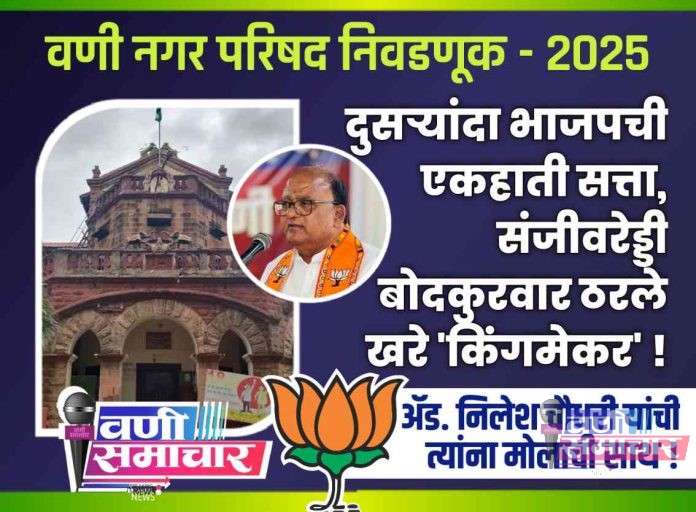 यवतमाळ जिल्ह्यातील वणी नगरपरिषद निवडणुकीत भारतीय जनता पक्षाने (भाजप) दणदणीत विजय मिळवत एकहाती सत्ता काबीज केली आहे. एकूण २९ नगरसेवकांच्या जागांपैकी भाजपने १८ जागा जिंकल्या, तसेच नगराध्यक्ष पदही त्यांच्या ताब्यात आले.या विजयाने माजी आमदार संजीवरेड्डी बोदकुरवार यांनी विधानसभा निवडणुकीतील पराभवाचा वचपा काढला असून, ते या निवडणुकीचे खरे ‘किंगमेकर’ ठरले आहेत. वणीकर जनतेचा भाजप आणि बोदकुरवारांच्या नेतृत्वावरचा विश्वास पुन्हा एकदा सिद्ध झाला आहे.