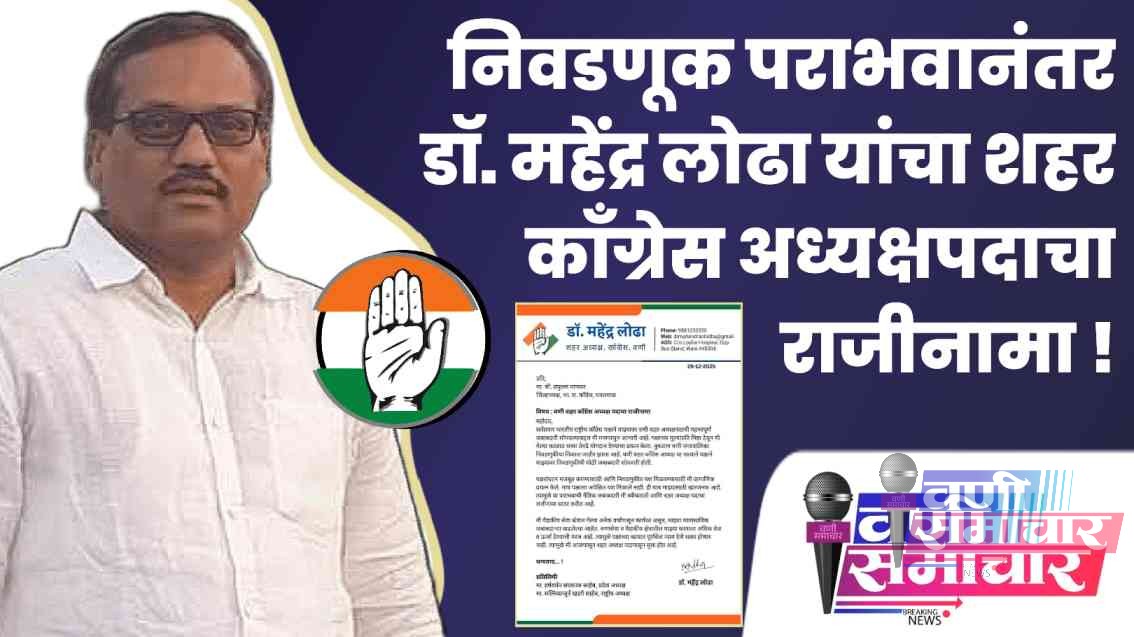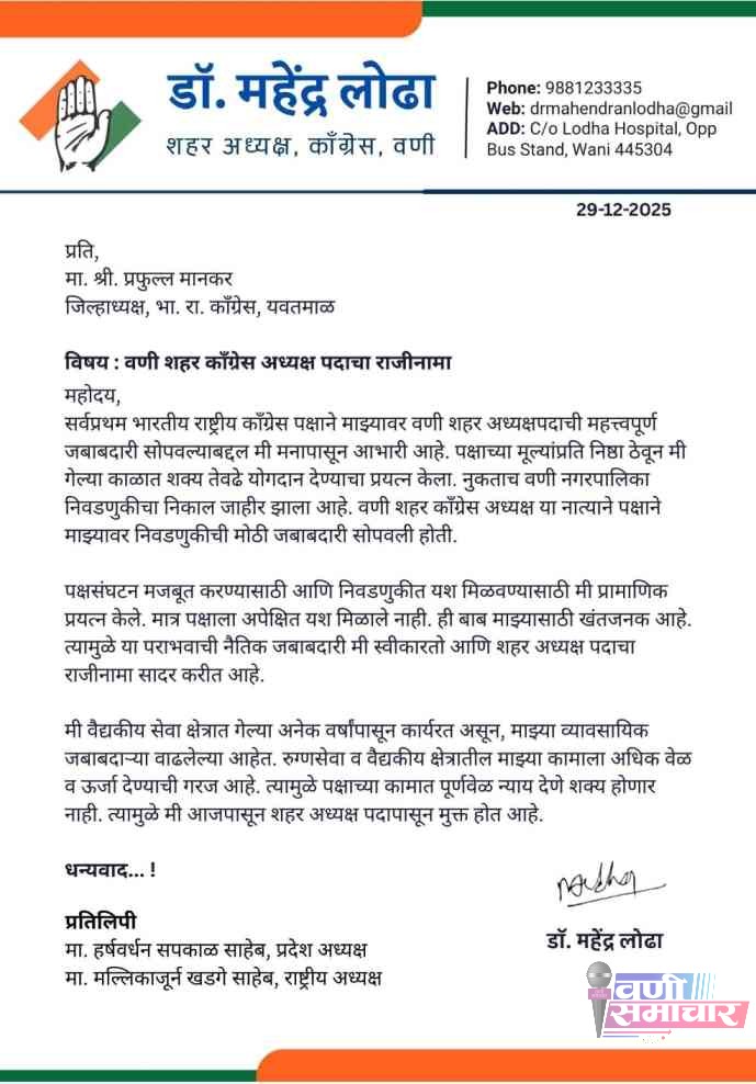 अलीकडेच झालेल्या वणी नगरपालिका निवडणुकीत भारतीय राष्ट्रीय काँग्रेस पक्षाला मोठा धक्का बसला असताना, शहर काँग्रेसचे अध्यक्ष तथा वैद्यकीय क्षेत्रातील प्रसिद्ध डॉ. महेंद्र लोढा यांनी आपल्या पदाचा सन्मानाने राजीनामा दिला आहे. हा राजीनामा यवतमाळ जिल्हा काँग्रेस अध्यक्ष प्रफुल्ल मानकर यांना सादर करण्यात आला असून, त्यात निवडणुकीतील अपयशाची नैतिक जबाबदारी आणि वैयक्तिक व्यावसायिक कारणे अशी प्रमुख कारणे नमूद आहेत.