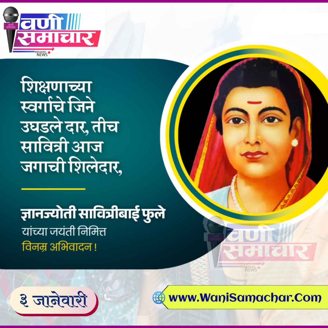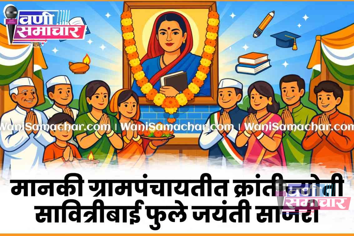 рд╡рдгреА рдкрдВрдЪрд╛рдпрдд рд╕рдорд┐рддреА рдЕрдВрддрд░реНрдЧрдд рдпреЗрдгрд╛рд▒реНрдпрд╛ рдореМрдЬрд╛ рдорд╛рдирдХреА рдпреЗрдереАрд▓ рдЧреНрд░рд╛рдордкрдВрдЪрд╛рдпрдд рдХрд╛рд░реНрдпрд╛рд▓рдпрд╛рдд рдЖрдЬ рд╢рдирд┐рд╡рд╛рд░, режрей рдЬрд╛рдиреЗрд╡рд╛рд░реА рд░реЛрдЬреА рд╕рдХрд╛рд│реА рео.рейреж рд╡рд╛рдЬрддрд╛ рдХреНрд░рд╛рдВрддреАрдЬреНрдпреЛрддреА рд╕рд╛рд╡рд┐рддреНрд░реАрдмрд╛рдИ рдлреБрд▓реЗ рдпрд╛рдВрдЪреА рдЬрдпрдВрддреА рдЕрддреНрдпрдВрдд рдЙрддреНрд╕рд╛рд╣рд╛рдд рд╕рд╛рдЬрд░реА рдХрд░рдгреНрдпрд╛рдд рдЖрд▓реА.
