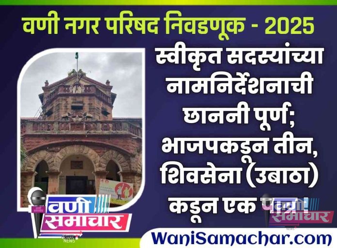 рд╡рдгреА рдирдЧрд░рдкрд░рд┐рд╖рджреЗрдд рд╕реНрд╡реАрдХреГрдд рд╕рджрд╕реНрдпрд╛рдВрдЪреНрдпрд╛ рдирд╛рдордирд┐рд░реНрджреЗрд╢рдирд╛рдЪреА рдЫрд╛рдирдиреА рдкреВрд░реНрдг; рднрд╛рдЬрдкрдХрдбреВрди рддреАрди, рд╢рд┐рд╡рд╕реЗрдирд╛ (рдЙрдмрд╛рдард╛) рдХрдбреВрди рдПрдХ рдкрд╛рддреНрд░ !