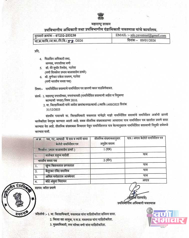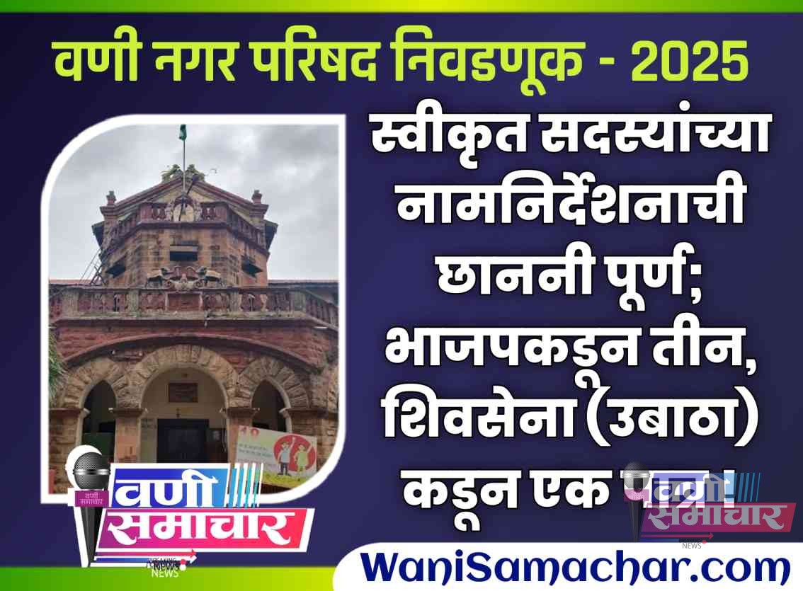 рд╡рдгреА рдирдЧрд░рдкрд░рд┐рд╖рджреЗрдд рд╕реНрд╡реАрдХреГрдд рд╕рджрд╕реНрдпрд╛рдВрдЪреНрдпрд╛ рдирд┐рдпреБрдХреНрддреАрд╕рд╛рдареА рд╕рд╛рджрд░ рдХрд░рдгреНрдпрд╛рдд рдЖрд▓реЗрд▓реНрдпрд╛ рдирд╛рдордирд┐рд░реНрджреЗрд╢рди рдкрддреНрд░рд╛рдВрдЪреА рдЫрд╛рдирдиреА рдкреВрд░реНрдг рдЭрд╛рд▓реА рдЖрд╣реЗ. рдпрд╡рддрдорд╛рд│ рдЙрдкрд╡рд┐рднрд╛рдЧреАрдп рдЕрдзрд┐рдХрд╛рд░реА рддрдерд╛ рджрдВрдбрд╛рдзрд┐рдХрд╛рд░реА рдпрд╛рдВрдиреА рддреМрд▓рдирд┐рдХ рд╕рдВрдЦреНрдпрд╛рдмрд│рд╛рдЪреНрдпрд╛ рдЖрдзрд╛рд░рд╛рд╡рд░ рдкрд╛рддреНрд░ рдЖрдгрд┐ рдЕрдкрд╛рддреНрд░ рдпрд╛рджреА рдЬрд╛рд╣реАрд░ рдХреЗрд▓реА рдЖрд╣реЗ. рдпрд╛рдиреБрд╕рд╛рд░ рднрд╛рдЬрдк рдХрдбреВрди рддреАрди, рддрд░ рд╢рд┐рд╡рд╕реЗрдирд╛ (рдЙ.рдмрд╛.рдард╛.) рдХрдбреВрди рдПрдХ рдирд╛рдордирд┐рд░реНрджреЗрд╢рди рдкрддреНрд░ рдкрд╛рддреНрд░ рдард░рд▓реЗ рдЖрд╣реЗ. рдпрд╛ рдЫрд╛рдирдиреАрдЪрд╛ рдЕрд╣рд╡рд╛рд▓ рдирдЧрд░рдкрд░рд┐рд╖рджреЗрд▓рд╛ рд╕рд╛рджрд░ рдХрд░рдгреНрдпрд╛рдд рдЖрд▓рд╛ рдЕрд╕реВрди, рдЖрддрд╛ рд╕рднреЗрдд рдЕрдВрддрд┐рдо рдирд┐рдпреБрдХреНрддреНрдпрд╛ рд╣реЛрдгрд╛рд░ рдЖрд╣реЗрдд.