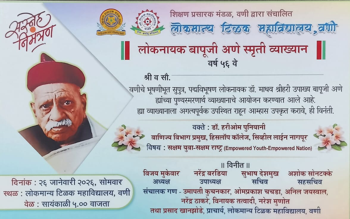 рд╢рд┐рдХреНрд╖рдг рдкреНрд░рд╕рд╛рд░рдХ рдордВрдбрд│, рд╡рдгреА рдпрд╛рдВрдЪреНрдпрд╛ рд╡рддреАрдиреЗ рд╕рдВрдЪрд╛рд▓рд┐рдд рд▓реЛрдХрдорд╛рдиреНрдп рдЯрд┐рд│рдХ рдорд╣рд╛рд╡рд┐рджреНрдпрд╛рд▓рдпрд╛рдд рд▓реЛрдХрдирд╛рдпрдХ рдмрд╛рдкреВрдЬреА рдЕрдгреЗ рдпрд╛рдВрдЪреНрдпрд╛ рд╕реНрдореГрддреАрдкреНрд░рд┐рддреНрдпрд░реНрде рд╡рд░реНрд╖ релрем рд╡реНрдпрд╛ ‘рд▓реЛрдХрдирд╛рдпрдХ рдмрд╛рдкреВрдЬреА рдЕрдгреЗ рд╕реНрдореГрддреА рд╡реНрдпрд╛рдЦреНрдпрд╛рди’ рдорд╛рд▓рд┐рдХреЗрдЪреЗ рдЖрдпреЛрдЬрди рдХрд░рдгреНрдпрд╛рдд рдЖрд▓реЗ рдЖрд╣реЗ. рд╣реЗ рд╡реНрдпрд╛рдЦреНрдпрд╛рди рд╡рд╛рдгреАрдЪреЗ рднреВрд╖рдг, рдкрджреНрдорд╡рд┐рднреВрд╖рдг рд▓реЛрдХрдирд╛рдпрдХ рдбреЙ. рдорд╛рдзрд╡ рд╢реНрд░реАрд╣рд░реА рдЙрдкрд╛рдЦреНрдп рдмрд╛рдкреВрдЬреА рдЕрдгреЗ рдпрд╛рдВрдЪреНрдпрд╛ рдкреБрдгреНрдпрд╕реНрдорд░рдгрд╛рд░реНрде рдЖрдпреЛрдЬрд┐рдд рдХрд░рдгреНрдпрд╛рдд рдЖрд▓реЗ рдЖрд╣реЗ.рдпрд╛ рд╡реНрдпрд╛рдЦреНрдпрд╛рдирд╛рдд рдкреНрд░рдореБрдЦ рд╡рдХреНрддреЗ рдореНрд╣рдгреВрди рдбреЙ. рд╣рд░реАрдУрдо рдкреБрдирд┐рдпрд╛рдиреА рд╣реЗ рдЙрдкрд╕реНрдерд┐рдд рд░рд╛рд╣рдгрд╛рд░ рдЖрд╣реЗрдд. рдбреЙ. рдкреБрдирд┐рдпрд╛рдиреА рд╣реЗ рдирд╛рдЧрдкреВрд░ рд╡рд┐рджреНрдпрд╛рдкреАрдард╛рдЪреНрдпрд╛ рд╡рд╛рдгрд┐рдЬреНрдп рд╡рд┐рджреНрдпрд╛рд╢рд╛рдЦреЗрдЪреЗ рдЕрд╕реЛрд╕рд┐рдПрдЯ рдбреАрди рдЕрд╕реВрди, рд╣рд┐рд╕реНрд▓реЙрдк рдХреЙрд▓реЗрдЬ, рд╕рд┐рд╡реНрд╣рд┐рд▓ рд▓рд╛рдЗрди, рдирд╛рдЧрдкреВрд░ рдпреЗрдереЗ рд╡рд╛рдгрд┐рдЬреНрдп рд╡рд┐рднрд╛рдЧ рдкреНрд░рдореБрдЦ рдореНрд╣рдгреВрди рдХрд╛рд░реНрдпрд░рдд рдЖрд╣реЗрдд. рдкреНрд░рдЦреНрдпрд╛рдд рдореЛрдЯрд┐рд╡реНрд╣реЗрд╢рдирд▓ рд╕реНрдкреАрдХрд░ рдореНрд╣рдгреВрди рддреНрдпрд╛рдВрдиреА рдЕрдиреЗрдХ рдард┐рдХрд╛рдгреА рдХрд╛рд░реНрдпрд╢рд╛рд│рд╛ рд╡ рд╡реНрдпрд╛рдЦреНрдпрд╛рдиреЗ рдШреЗрддрд▓реА рдЕрд╕реВрди, рдпреБрд╡рдХрд╛рдВрдирд╛ рдкреНрд░реЗрд░рдгрд╛ рджреЗрдгрд╛рд▒реНрдпрд╛ рд╡рд┐рд╖рдпрд╛рдВрд╡рд░ рддреНрдпрд╛рдВрдЪреЗ рдорд╛рд░реНрдЧрджрд░реНрд╢рди рдкреНрд░рднрд╛рд╡реА рдард░рддреЗ.