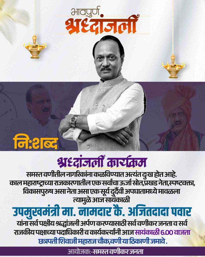 рдорд╣рд╛рд░рд╛рд╖реНрдЯреНрд░рд╛рдЪреНрдпрд╛ рд░рд╛рдЬрдХреАрдп рдкрдЯрд▓рд╛рд╡рд░ рдПрдХ рджрд┐рдЧреНрдЧрдЬ рдиреЗрддреЗ рдореНрд╣рдгреВрди рдУрд│рдЦрд▓реЗ рдЬрд╛рдгрд╛рд░реЗ, рд░рд╛рдЬреНрдпрд╛рдЪреЗ рд▓рд╛рдбрдХреЗ рдЙрдкрдореБрдЦреНрдпрдордВрддреНрд░реА рдЕрдЬрд┐рддрджрд╛рджрд╛ рдкрд╡рд╛рд░ рдпрд╛рдВрдЪреНрдпрд╛ рдирд┐рдзрдирд╛рдиреЗ рд╕рдВрдкреВрд░реНрдг рд░рд╛рдЬреНрдп рд╢реЛрдХрд╕рд╛рдЧрд░рд╛рдд рдмреБрдбрд╛рд▓реЗ рдЖрд╣реЗ. рдпрд╛ рджреБрдГрдЦрдж рдШрдЯрдиреЗрдЪреНрдпрд╛ рдкрд╛рд░реНрд╢реНрд╡рднреВрдореАрд╡рд░ рд╡рдгреА рд╢рд╣рд░рд╛рддреАрд▓ рд╕рд░реНрд╡ рдирд╛рдЧрд░рд┐рдХ, рд░рд╛рдЬрдХреАрдп рдкрдХреНрд╖рд╛рдВрдЪреЗ рдкрджрд╛рдзрд┐рдХрд╛рд░реА рдЖрдгрд┐ рдХрд╛рд░реНрдпрдХрд░реНрддреЗ рдПрдХрддреНрд░ рдпреЗрдКрди рддреНрдпрд╛рдВрдирд╛ рднрд╛рд╡рдкреВрд░реНрдг рд╢реНрд░рджреНрдзрд╛рдВрдЬрд▓реА рд╡рд╛рд╣рдгреНрдпрд╛рд╕рд╛рдареА рд╡рд┐рд╢реЗрд╖ рдХрд╛рд░реНрдпрдХреНрд░рдо рдЖрдпреЛрдЬрд┐рдд рдХрд░рдгреНрдпрд╛рдд рдЖрд▓рд╛ рдЖрд╣реЗ. рдЖрдЬ рд╕рд╛рдпрдВрдХрд╛рд│реА рем рд╡рд╛рдЬрддрд╛ рдЫрддреНрд░рдкрддреА рд╢рд┐рд╡рд╛рдЬреА рдорд╣рд╛рд░рд╛рдЬ рдЪреМрдХрд╛рдд рд╣реЛрдгрд╛рд▒реНрдпрд╛ рдпрд╛ рд╕рд░реНрд╡рдкрдХреНрд╖реАрдп рд╕рднреЗрдд рд╕рд╛рдорд╛рдЬрд┐рдХ рдЖрдгрд┐ рд░рд╛рдЬрдХреАрдп рдХреНрд╖реЗрддреНрд░рд╛рддреАрд▓ рдорд╛рдиреНрдпрд╡рд░ рдЙрдкрд╕реНрдерд┐рдд рд░рд╛рд╣рдгрд╛рд░ рдЖрд╣реЗрдд.