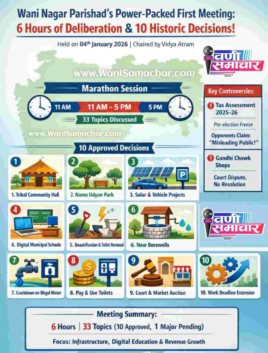 पहिलीच सभा सहा तास चालणे हे लोकप्रतिनिधींच्या वणी शहराप्रती असलेल्या जागरूकतेचे लक्षण आहे. आदिवासी सभागृह आणि डिजिटल शाळांसारखे निर्णय स्वागतार्ह आहेत. मात्र, प्रशासनाने कर आकारणी आणि अतिक्रमण यांसारख्या मुद्द्यांवरून जनतेमध्ये असंतोष निर्माण होणार नाही, याची काळजी घेऊन मधला मार्ग काढणे वणीच्या विकासासाठी अधिक हितकारक ठरेल.
