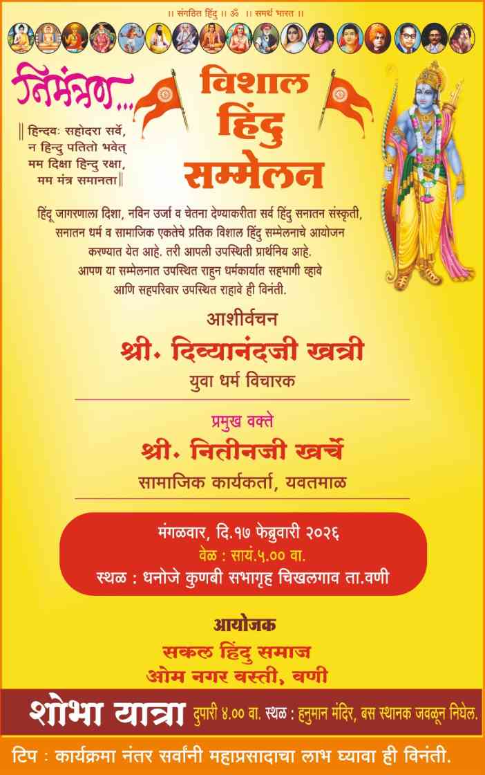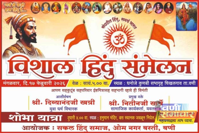राष्ट्रीय स्वयंसेवक संघाच्या (RSS) शतकपूर्ती सोहळ्यानिमित्त देशभरात हिंदू जागरणाचे वारे वाहत आहेत. याच ऐतिहासिक पर्वात वणी शहरातही हिंदुत्वाची चेतना उफाळून येणार आहे. ओम नगर वस्तीत उद्या मंगळवार, १७ फेब्रुवारी २०२६ रोजी ‘विशाल हिंदू संमेलन’ चे भव्य आयोजन करण्यात आले आहे. सकल हिंदू समाजातील एकता, समरसता आणि स्वाभिमान जागवण्यासाठी हे संमेलन केवळ एक कार्यक्रम नसून, एक सांस्कृतिक क्रांती ठरणार आहे!