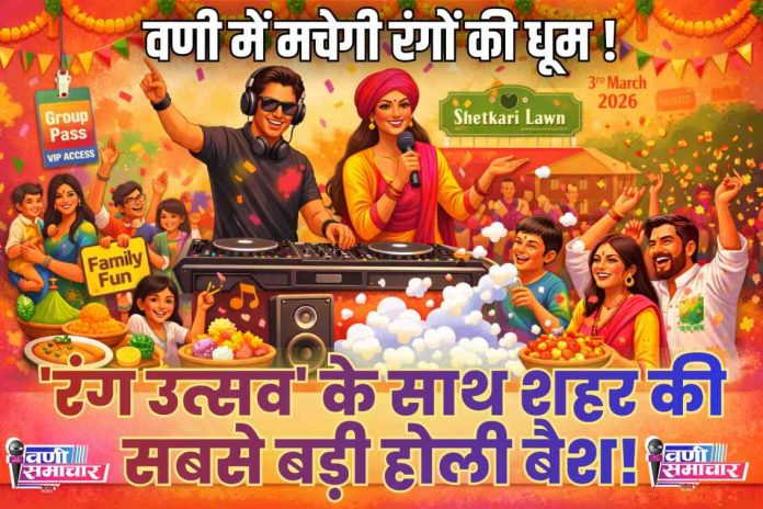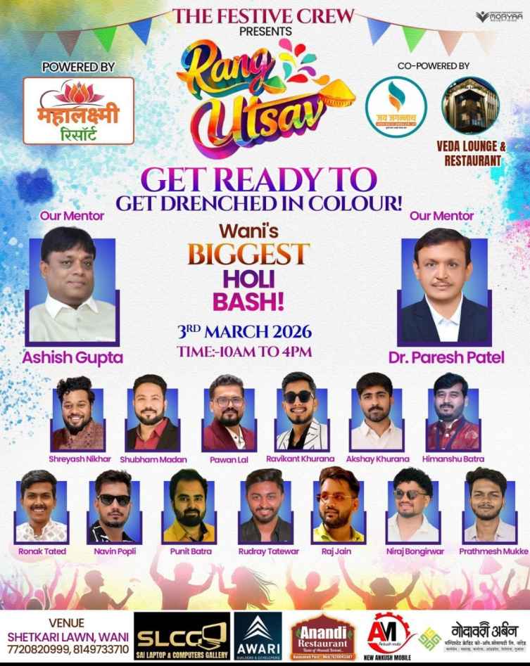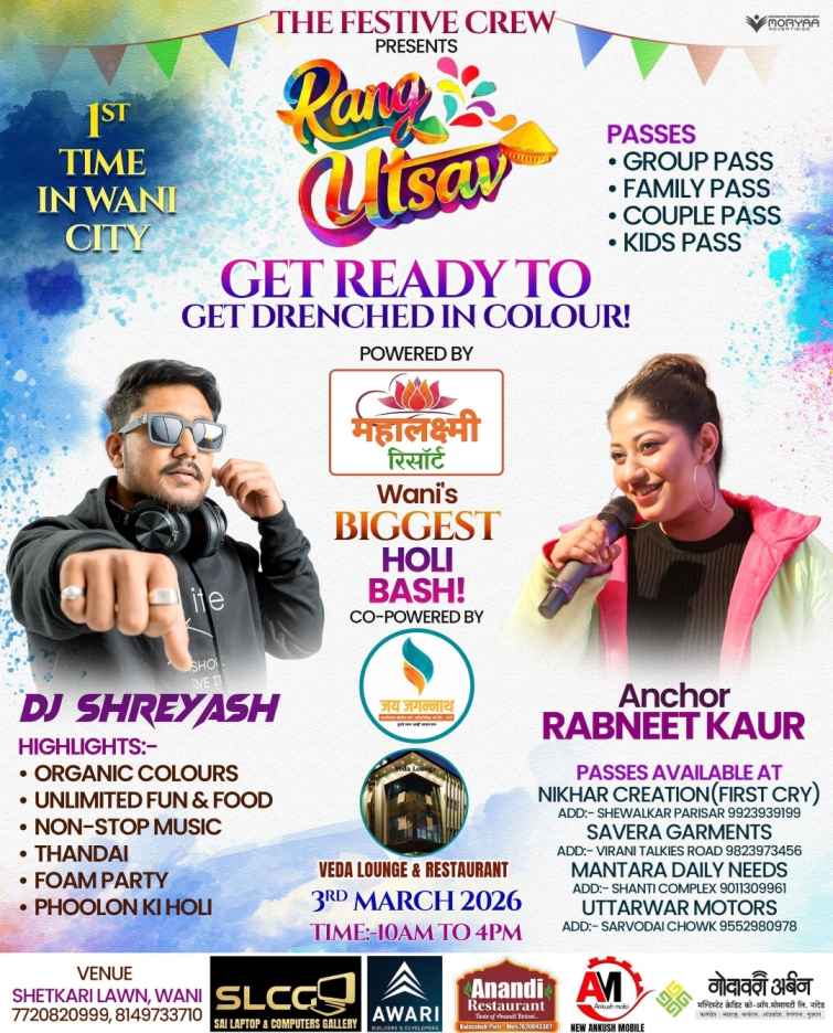 рд░рдВрдЧреЛрдВ рдХрд╛ рддреНрдпреЛрд╣рд╛рд░ рд╣реЛрд▓реА рдЗрд╕ рдмрд╛рд░ рд╡рдгреА рд╡рд╛рд╕рд┐рдпреЛрдВ рдХреЗ рд▓рд┐рдП рдХреБрдЫ рдЦрд╛рд╕ рдФрд░ рдмреЗрд╣рдж рд░реЛрдорд╛рдВрдЪрдХ рд╣реЛрдиреЗ рд╡рд╛рд▓рд╛ рд╣реИред ‘рдж рдлреЗрд╕реНрдЯрд┐рд╡ рдХреНрд░реВ’ (The Festive Crew) рдЖрдкрдХреЗ рд▓рд┐рдП рд▓реЗрдХрд░ рдЖрдП рд╣реИрдВ рд╡рдгреА рд╢рд╣рд░ рдХрд╛ рдЕрдм рддрдХ рдХрд╛ рд╕рдмрд╕реЗ рдмрдбрд╝рд╛ рд╣реЛрд▓реА рдЗрд╡реЗрдВрдЯтАФ “рд░рдВрдЧ рдЙрддреНрд╕рд╡ – WaniтАЩs Biggest Holi Bash!”ред 3 рдорд╛рд░реНрдЪ 2026 рдХреЛ рд╣реЛрдиреЗ рд╡рд╛рд▓рд╛ рдпрд╣ рднрд╡реНрдп рдЖрдпреЛрдЬрди рди рдХреЗрд╡рд▓ рдордиреЛрд░рдВрдЬрди рдХрд╛ рдХреЗрдВрджреНрд░ рд╣реЛрдЧрд╛, рдмрд▓реНрдХрд┐ рд╡рдгреА рдХреЗ рд╕рд╛рдВрд╕реНрдХреГрддрд┐рдХ рдЗрддрд┐рд╣рд╛рд╕ рдореЗрдВ рдПрдХ рдирдпрд╛ рдЕрдзреНрдпрд╛рдп рд▓рд┐рдЦреЗрдЧрд╛ред