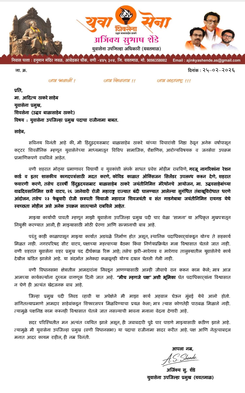२५ फेब्रुवारी २०२६ रोजी अजिंक्य शेंडे यांनी युवासेना प्रमुख आदित्य ठाकरे यांना राजीनामा पत्र पाठवले. ते वणी विधानसभा क्षेत्रातील युवासेना उपजिल्हाप्रमुख होते. हा राजीनामा अचानक आणि सार्वजनिकरित्या जाहीर करण्यात आला, ज्यामुळे पक्षात खळबळ उडाली आहे.