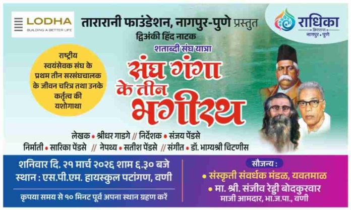 рд╡рд┐рджрд░реНрдн рдХреА рдкрд╛рд╡рди рдзрд░рд╛ рд╡рдгреА рд╢рд╣рд░ рдПрдХ рдРрддрд┐рд╣рд╛рд╕рд┐рдХ рд╕рд╛рдВрд╕реНрдХреГрддрд┐рдХ рдПрд╡рдВ рд╡реИрдЪрд╛рд░рд┐рдХ рд╕рдВрдзреНрдпрд╛ рдХрд╛ рд╕рд╛рдХреНрд╖реА рдмрдирдиреЗ рдЬрд╛ рд░рд╣рд╛ рд╣реИред рд░рд╛рд╖реНрдЯреНрд░реАрдп рд╕реНрд╡рдпрдВрд╕реЗрд╡рдХ рд╕рдВрдШ (RSS) рдХреЗ рд╢рддрд╛рдмреНрджреА рд╡рд░реНрд╖ рдХреЗ рдЙрдкрд▓рдХреНрд╖реНрдп рдореЗрдВ, рд╕рдВрдШ рдХреЗ рдЖрдзрд╛рд░ рд╕реНрддрдВрдн рд░рд╣реЗ рдкреНрд░рдердо рддреАрди рд╕рд░рд╕рдВрдШрдЪрд╛рд▓рдХреЛрдВ рдХреЗ рдЬреАрд╡рди рдФрд░ рд╕рдВрдШрд░реНрд╖ рдкрд░ рдЖрдзрд╛рд░рд┐рдд рдорд╣рд╛рдирд╛рдЯреНрдп ‘рд╕рдВрдШ рдЧрдВрдЧрд╛ рдХреЗ рддреАрди рднрдЧреАрд░рде’ рдХрд╛ рдордВрдЪрди рдЖрдЧрд╛рдореА рд╢рдирд┐рд╡рд╛рд░, 21 рдорд╛рд░реНрдЪ 2026 рдХреЛ рд╣реЛрдиреЗ рдЬрд╛ рд░рд╣рд╛ рд╣реИред