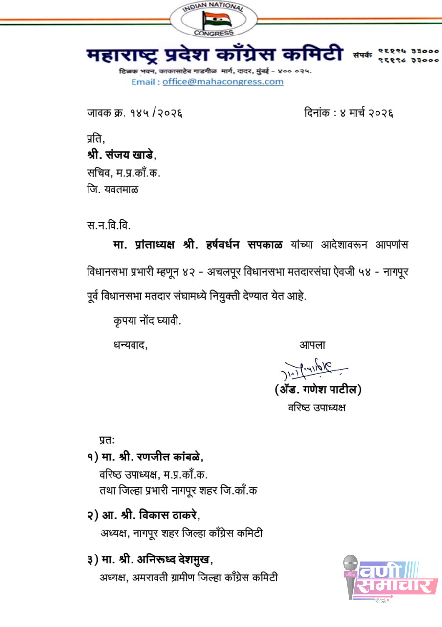 प्रदेशाध्यक्ष हर्षवर्धन सपकाळ यांच्या आदेशानुसार ही अतिरिक्त जबाबदारी सोपवण्यात आली असून, यामुळे वणीसह विदर्भातील काँग्रेस कार्यकर्त्यांमध्ये उत्साहाचे वातावरण आहे.