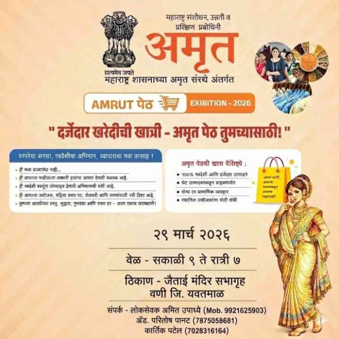 येत्या २९ मार्च रोजी वणी शहरात खरेदीचा एक अनोखा उत्सव साजरा होणार आहे. महाराष्ट्र शासनाच्या ‘अमृत’ (महाराष्ट्र संशोधन, उन्नती व प्रशिक्षण प्रबोधनी) संस्थेच्या वतीने ‘अमृत पेठ – २०२६’ या विशेष प्रदर्शनाचे आयोजन करण्यात आले असून, वणीकरांना एकाच छताखाली शुद्ध, दर्जेदार आणि अस्सल स्वदेशी वस्तूंची खरेदी करण्याची सुवर्णसंधी मिळणार आहे.