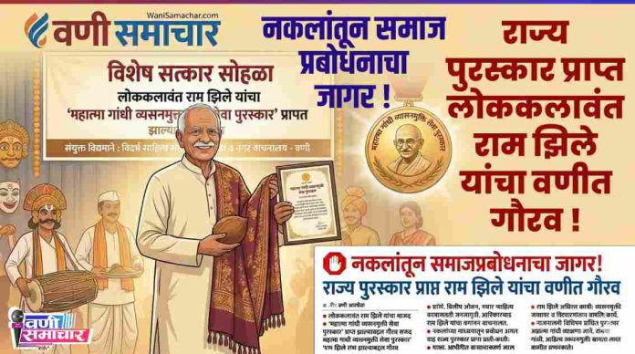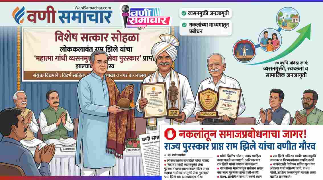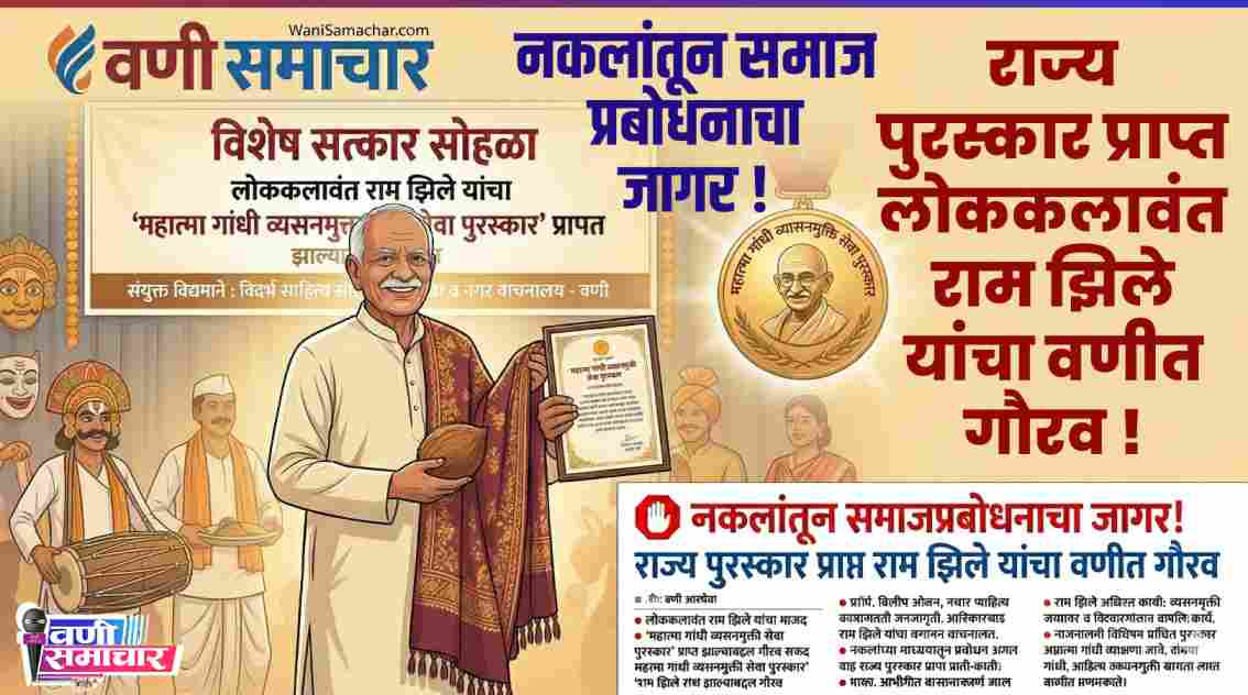 рдирдХрд▓рд╛рдВрдЪреНрдпрд╛ рдорд╛рдзреНрдпрдорд╛рддреВрди рдЧреЗрд▓реНрдпрд╛ рекреж рд╡рд░реНрд╖рд╛рдВрдкрд╛рд╕реВрди рд╡реНрдпрд╕рдирдореБрдХреНрддреА рдЖрдгрд┐ рд╕реНрд╡рдЪреНрдЫрддреЗрдЪрд╛ рд╕рдВрджреЗрд╢ рдШрд░рд╛рдШрд░рд╛рдд рдкреЛрд╣реЛрдЪрд╡рдгрд╛рд░реЗ рдирд┐рд│рд╛рдкреВрд░рдЪреЗ рд╕реБрдкреБрддреНрд░ рд░рд╛рдо рдЭрд┐рд▓реЗ рдпрд╛рдВрдЪрд╛ рд╡рдгреА рдпреЗрдереЗ рд╢рд╛рдирджрд╛рд░ рд╕рддреНрдХрд╛рд░ рдХрд░рдгреНрдпрд╛рдд рдЖрд▓рд╛. рдорд╣рд╛рд░рд╛рд╖реНрдЯреНрд░ рд╢рд╛рд╕рдирд╛рдЪрд╛ рдорд╛рдирд╛рдЪрд╛ тАШрдорд╣рд╛рддреНрдорд╛ рдЧрд╛рдВрдзреА рд╡реНрдпрд╕рдирдореБрдХреНрддреА рд╕реЗрд╡рд╛ рдкреБрд░рд╕реНрдХрд╛рд░тАЩ рдорд┐рд│рд╛рд▓реНрдпрд╛рдмрджреНрджрд▓ рд╡рд┐рджрд░реНрдн рд╕рд╛рд╣рд┐рддреНрдп рд╕рдВрдШ рдЖрдгрд┐ рдирдЧрд░ рд╡рд╛рдЪрдирд╛рд▓рдп рдпрд╛рдВрдЪреНрдпрд╛ рд╕рдВрдпреБрдХреНрдд рд╡рд┐рджреНрдпрдорд╛рдиреЗ рд╣рд╛ рд╕реЛрд╣рд│рд╛ рдкрд╛рд░ рдкрдбрд▓рд╛.