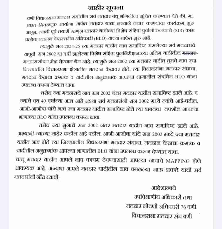 рдЙрдкрд╡рд┐рднрд╛рдЧреАрдп рдЕрдзрд┐рдХрд╛рд░реА рддрдерд╛ рдорддрджрд╛рд░ рдиреЛрдВрджрдгреА рдЕрдзрд┐рдХрд╛рд░реА, рд╡рдгреА рдпрд╛рдВрдиреА рдпрд╛рдмрд╛рдмрддрдЪреА рдПрдХ рдЕрдзрд┐рдХреГрдд рдЬрд╛рд╣реАрд░ рд╕реВрдЪрдирд╛ рдиреБрдХрддреАрдЪ рдирд┐рд░реНрдЧрдорд┐рдд рдХреЗрд▓реА рдЖрд╣реЗ.